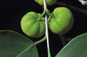 Here each Pedicel is up to 1cm long (green in photo 342). The fleshy and more or less spherical Fruit is up to 1,5 x 1cm. It is a locular Capsule (a dry fruit resulting from the maturing of a compound ovary that usually opens at maturity by one or more lines of dehiscence). The ripe 4 locular fruit contains 8-10 ridges (photo 344) which become wrinkled when dry. Eventually only 1 seed develops in each locule. This is because the second ovule aborts. The capsule dehisces explosively while still on the tree. Many capsules may be simultaneously present on the tree at various stages of development. The narrow oblong, smooth and shiny, often parasitized, Seeds are slightly triangular, brown and small – up to 8 x 6mm and have an attached fleshy structure. The embryo is minute and the 2 cotyledons (seed leaf; primary leaf or leaves in the embryo) are broad and flat. A papery endosperm (the starch and oil-containing tissue of many seeds; often referred to as the albumen) is present. (Nov to Dec – to all year).