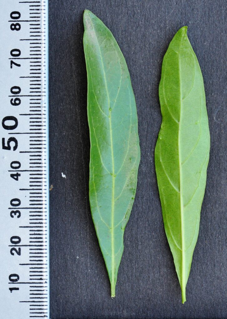 In the sun the foliage glossy green. This evergreen tree has opposite Leaves that are decussate (arranged in pairs each at right angles to the next pair above or below i.e., rotated 90 degrees along the stem when viewed from above – photo 67). The slender leaves are elliptic (photo 889) to lanceolate (tapering to a point) and may be thin to slightly leathery. Individual leaves are glabrous (hairless) and simple (have a single blade which may have incisions that are not deep enough to divide the leaf into leaflets). Leaves measure up to 10 x 2cm but are usually smaller (photo 889). This photo shows the leaves are usually glossy dark green above and a duller green below. The blade may also have tiny, circular scattered bacterial nodules that are round to elongate and visible on the leaf surfaces. The 3-5 pairs of side veins are spread apart and clearly visible on both sides (photo 889) and here Domatia may be present. Domatia are places constructed by plants for tiny arthropods. In this plant they may be visible on the underside of leaves (photo 68) and are often present in the main leaf vein joints. They are produced by plants to house tiny arthropods in a mutualistic relationship, where both the plants and the arthropods benefit. The Apex and Base are both narrowly tapering. Margins are entire (with a continuous margin, not in any way indented). They may be rolled under and slightly wavy. The relatively short Petiole (leaf stalk) is up to 6mm long (photo 889). The cone-shaped Stipules (outgrowths usually on both sides of the base of a petiole photo 300). Crushed Leaves have a spicy smell.