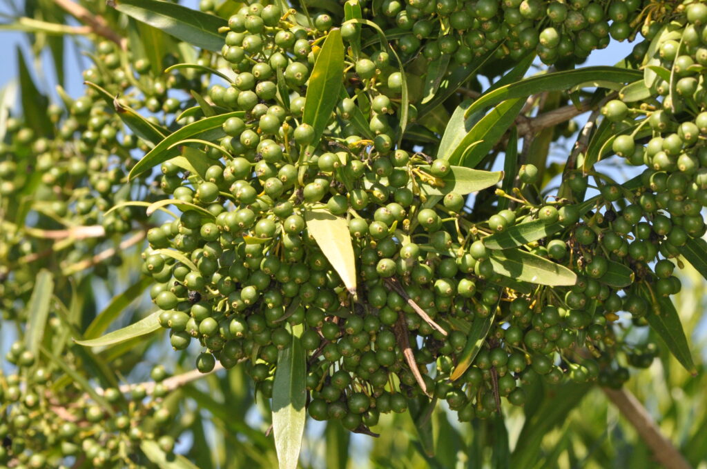 The Fruit is a slightly fleshy, pea-sized Drupe (fleshy, 1-seeded indehiscent fruits with each seed enclosed in a stony endocarp; stone fruit like a peach) that occurs in dense clusters (photo 387). The fruit is almost spherical and up to 7mm in diameter. It is initially green, becomes black, and finally shrivels (photo 387). In this photo, the remains of the persistent and truncate calyx may be visible at the end of a fruit. Usually only one almost spherical Seed is produced in each fruit. (Feb-Jul).