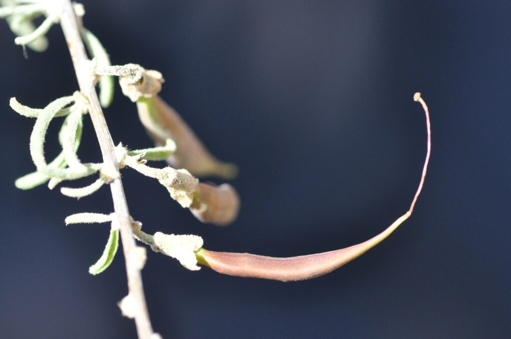The young fruit Apex ends in a sharply pointed tip arising from the long style (photo 105).  In this photo the remains of the stigma are still present.  The smooth, light green to pale brown flattened and thin-walled pod-like Fruit is a compressed beaked Capsule (a dry fruit resulting from the maturing of a compound ovary that usually opens at maturity by one or more lines of dehiscence – photo 99R).  Here the mature dehiscent capsules are up to 7 x 1,5 cm.  In order to release seeds, the mature capsule splits perpendicularly down the centre (photo 105) into two valves that become loose.  In this photo (and photo 104) the persistent calyx is visible at the Base.  As the fruit matures the remains of the style falls and the fruit expands with its developing Seeds (photo 104).  The light brown paper winged seeds are about 2 x 2cm – including the paper wings.  Old brown empty capsules may remain on the plant for months.  (Dec-May).
