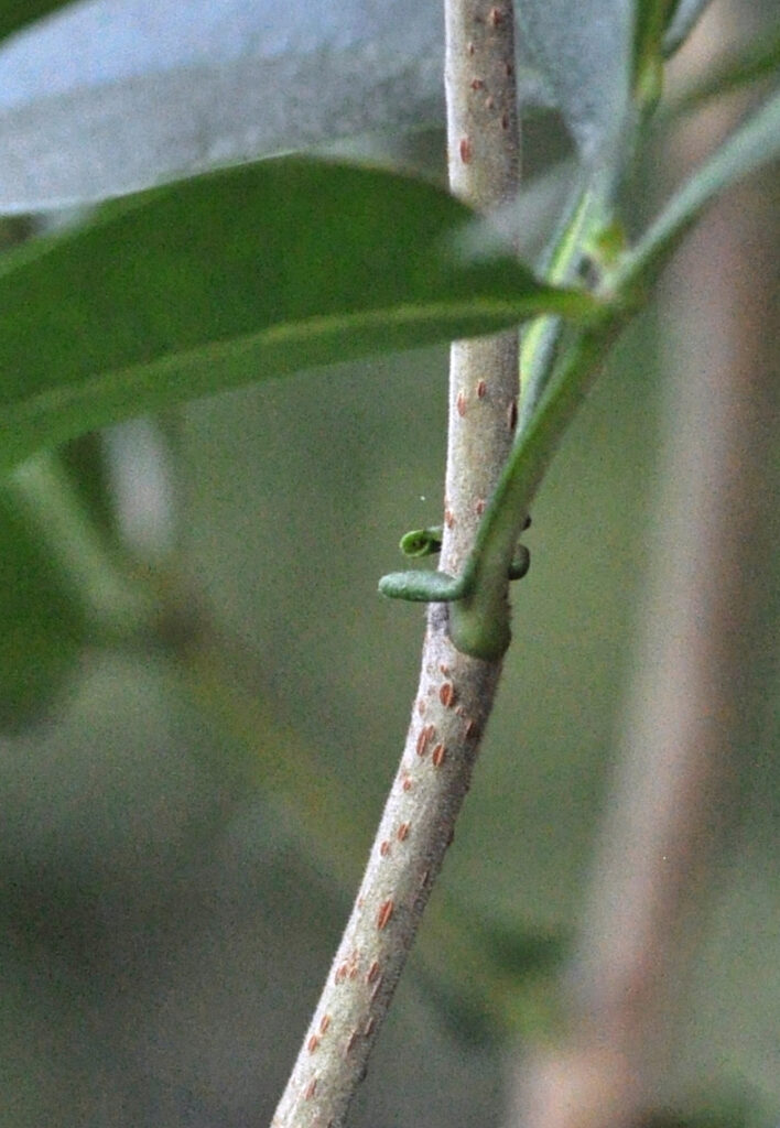 Spines are absent on this small attractive Tree (photo 511) that occurs in open woodland, margins of evergreen forests and bushveld (is a sub-tropical mineral-rich woodland ecoregion of southern Africa).  The crown is sparse and rests on usually upright branches (photo 797). The plant is usually up to 8m high but may reach 15m.  It can also be a shrub.  Lenticels (usually raised corky oval or elongated areas on the plant that allows the uncontrolled interchange of gases with the environment) are visible on young branches (photo 902).  The tree Trunk is up to 30cm wide.  Bark is soft grey or light brown and has irregularly cracks (photos 795 & 504) or flakes (photo 794).  Branches lack the short dense hairs present on Schrebera argyrotricha.