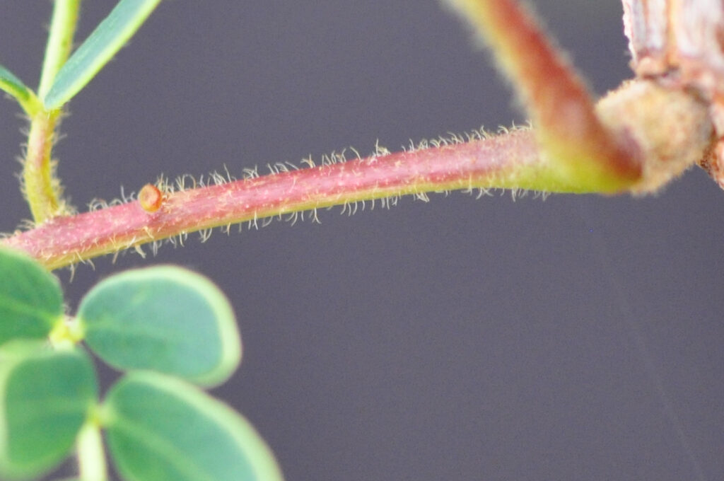 The Leaves are velvety (having a smooth, soft appearance) and up to 9cm long. The often-hairy Petiole (leaf stalk) is up to about 3,5cm long and is often a sun induced reddish above (photos 399 & 397). A small, stalked gland often occurs about halfway up the petiole (photos 399 & 397). The thin Stipules (basal appendages of the petiole) are thread-like and do not become spinescent (spiny – photo 43 under Tree). Leaves are bipinnate (Compound: twice pinnate. The central axis or Rachis (N.B. rachis length excuses the petiole) has lateral pinnae “branches” not leaflets and the pinnules Leaflets – photo 399 are on these “side branches”. Leaves have 4-14 pairs of lateral Pinnae (sub-divisions) – each of which has up to 19 (usually less) pairs of leaflets. Leaflet number, size and shape varies. Leaflets are usually slightly obovate (egg-shaped – with the narrower end at the base) to almost rounded. Leaflets may be bluish dull green above, lighter below (photo 399) and up to 2 x 1,3cm. The Margin is entire (with a continuous margin, not in any way indented) and may have a fringe of hairs (photo 76). In this photo the hairy leaflet Base is asymmetric (not equal to the opposite side). Petiolules (stalks of leaflets) are very short (photos 270 & 76).