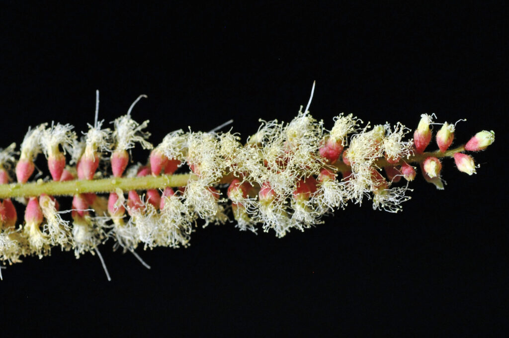 Flowering occurs at branch ends with the mature leaves (photo 470). The very small Flowers are contained in bottlebrush like, initially white elongated Spikes (simple indeterminate inflorescences with sessile flowers on a single unbranched axis opening in succession towards the apex – photo 61). The spikes are clustered. Each spike is up to 8,5cm long and rests on a single Peduncle (stalk of flower clusters – photo 182).
