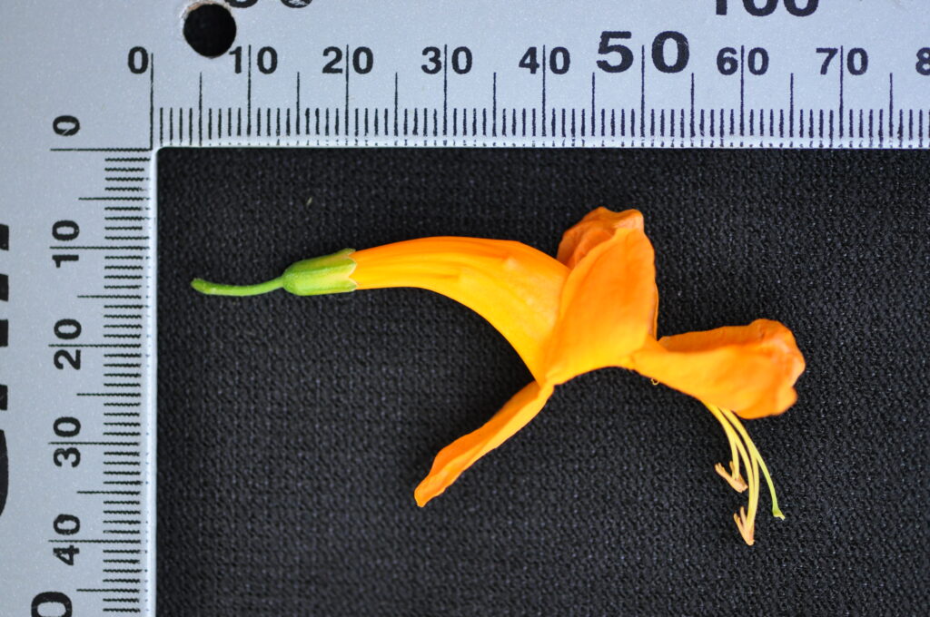 Flowering is most abundant after rain and flowers appear in terminal sprays. The impressive bisexual Flowers are up to 6cm long (photo 246) and Zygomorphic (floral parts unequal in size or form so that the flower is capable of division into essentially symmetrical halves by only one longitudinal plane passing through the axis). They are borne at branch ends in terminal sprays of up to 32cm long (photo 243). A short Pedicel (stalk of a single flower) attaches each flower to the stem (photo 243). In individual flowers, the short (5-9mm) Calyx is campanulate (shaped like a bell) and made up of 5 joined green Sepals (photo 246) forming a short tube at the base and each sepal lobe ends with a short tapering tip (photo 246). The curved Corolla is tubular, narrower at the base and trumped shaped. It is externally glabrous (hairless) and has some hairs within. The corolla widens at the mouth and is up to 5,5cm long and has 2 lobes. The upper lobe resembles a hood, and the lowermost lobe is lip-like (photo 439). The vivid colours of these petals vary between orange (natural), red, scarlet and yellow. They strongly and attractively contrast with the leaves.